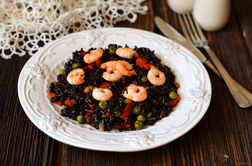 Чорний рис рецепт з овочами та креветками