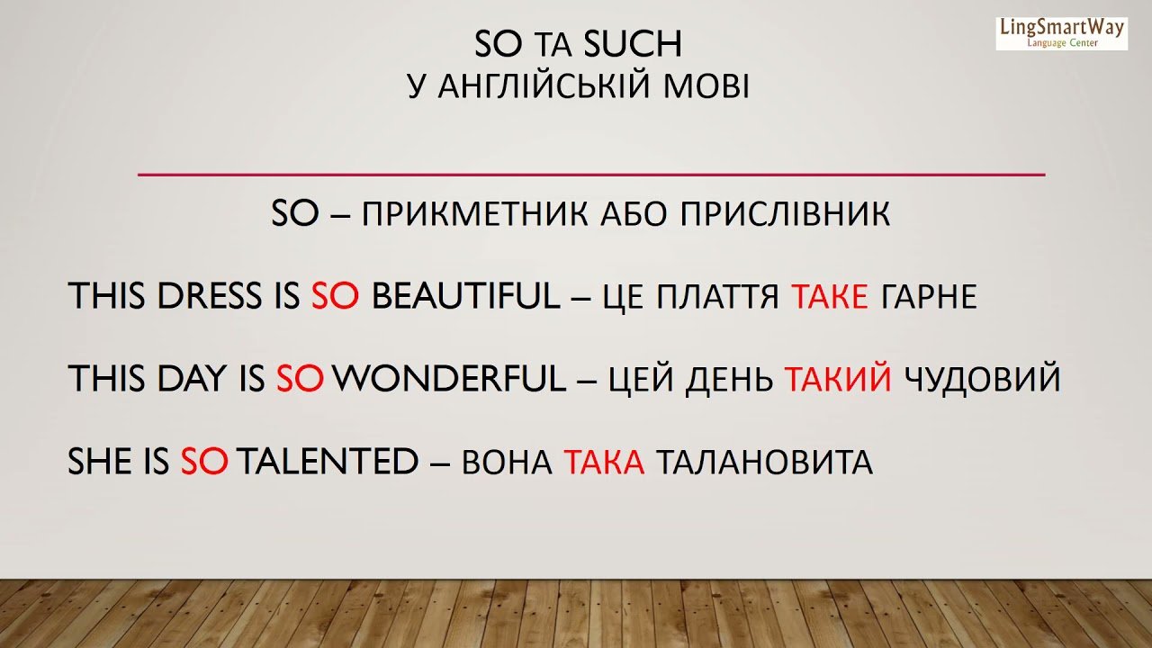 - Such + іменник/прикметник іменника: “She is such a beautiful girl.” — Вона така гарна дівчина.